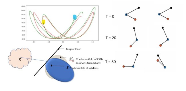The experiment described here used only the most trivial LSTM network and tiny training set sizes.   The initial value problems we considered were a two dimensional submanifold of the 4 dimensional space:  in the case of the projectile, the origin was fixed and the speed and angle were free variables and in the pendulum, we had the two angles free and the initial angular velocities were set to 0.  Each point of the initial conditions is a point on the configuration manifold (which is a cylinder defined by angle and speed for the projectile and a torus defined by the two angles of the pendulum).  The differential equations specify a unique path from that initial point along the configuration manifold.  The LSTM defines another path from the same initial point along the manifold.  The question is  how are these two paths related?