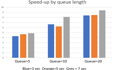These are not the most scientific results: each measurement was repeated only 3 times. However, the full code available for tests of your own. The maximum speed-up was 9.4 when the worker delay was 7 seconds and the queue length was 20. The code and data are in Github.