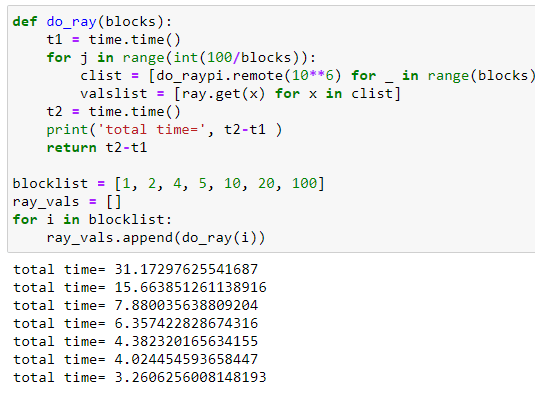Ray is designed to exploit the parallelism in large scale distributed applications and, like Parsl and Dask, it uses the concept of futures as a fundamental mechanism. Futures are object returned from function invocations that are placeholders for “future” returned values. The calling context can go about other business while the function is executing in another thread, perhaps on another machine. When the calling function needs the actual value computed by the function it makes a special call and suspends until the value is ready. Ray is easy to install on your laptop. Here is a trivial example.