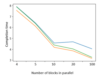 As can be seen the best time is when we compute 100 independent blocks. The sequential time is when it is computed as a sequential series of 100 Pi tasks. The speedup is 9.56. We also did the same computation using Dask and Parsl. In the chart below we show the relative performance .The graph shows the execution time on the vertical axis and the horizontal is the block sizes 4, 5, 10, 20, 100. As you can see Dask is fastest but Ray in about the same when we have 100 blocks in parallel.
