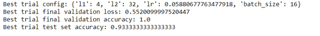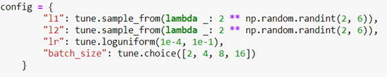 This says that l1 and l2 are powers of 2 between 4 and 64 and the learning rate lr is drawn from the log uniform distribution and the batch size is one of those listed. Tune will extract instances of the configuration parameters and train the model with each instance by using Ray’s asynchronous concurrent execution.