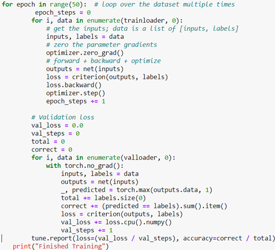 To run Tune on the model you need to wrap it in a function that will encapsulate the model with instances of the configuration. The wrapped model executes a standard (in this case torch) training loop followed by a validation loop which computes an average loss and accuracy for that set of parameters.