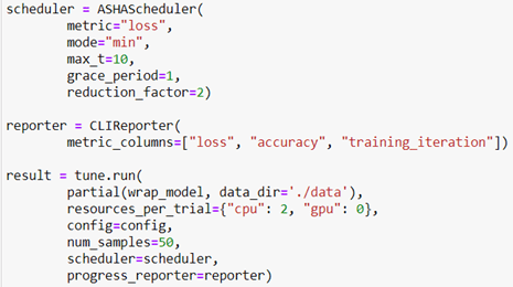 One of the most interesting part of Tune is how they schedule the training-validation tasks to search the space to give the optimal results. The scheduler choices include HyperBand, Population Based Training and more. The one we use here is Asynchronous Successive Halving Algorithm (ASHA) (Li, et.al. “[1810.05934v5] A System for Massively Parallel Hyperparameter Tuning (arxiv.org)” ) which, as the name suggests, implements a halving scheme that rejects regions that do not show promise and uses a type of genetic algorithm to create promising new avenues. We tell the scheduler we want to minimize a the loss function and invoke that with the tune.run() operator as follows.