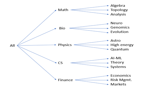To illustrate Ray actors and the Ray web server will now describe an “application” that dynamically builds a small hierarchy of actors. This application will classify documents based on the document title. It will first classify them into top-level topics and, for each top-level topic subdivided further into subtopic as shown in Figure 1. Our goal here is not actually to classify documents, but to illustrate how Ray works and how we might find ways to exploit parallelism. Our top-level topics are “math”, “physics”, “compsci”, “bio” and “finance”. Each of these will have subtopics. For example “math” has subtopics, “analysis”, “algebra” and “topology”.