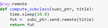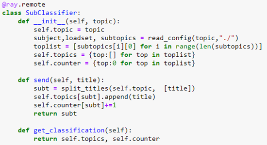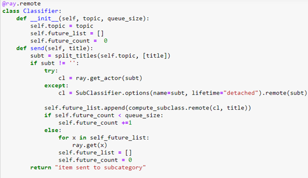 The Classifier actor is shown below. It works as follows. A classifier instance has a method “send(title)” which uses the utility function split_titles to extract the top-level category of the document. But to get the subcategory we need to discover and attach the subcategory topic tag to the title. A separate function compute_subclass does that. For each top-level category, we get the actor instance by name, or if it does not exist yet, we create it. Because computing the subclass may require the computational effort of a ML algorithm, we invoke compute_subclass as remote and store the future to that computation in a list and go on and process the next title. If the list reaches a reasonable limit (given by the parameter queue_size) we empty the list and start again. Emptying the list requires waiting until all futures are resolved. This is also a way to throttle concurrency.