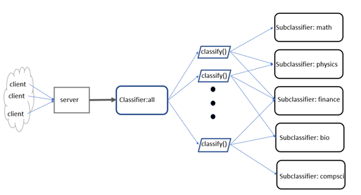 Figure 2. The microservice-like collection of Ray actors and function invocations. The clients send titles to the webserver “server” as http put requests. The server makes remote calls to the classifier instance which spawns compute_subclass invocations (labeled “classify()” here) and these invoke the send method on the subclassifiers.