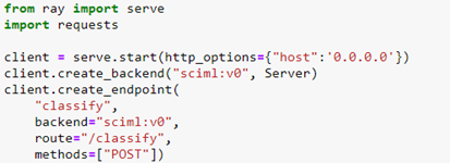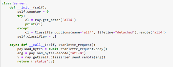 Note that this is not a ray.remote class. Once Ray Serve creates an instance of the server which, in turn grabs an instance of the Classifier actor). The Server object has an async/await coroutine that is now used in the Python version of ASGI, the Asynchronous Server Gateway Interface. The call function invokes the send operation on the classifier. To create and tie the backend to the endpoint we do the following.