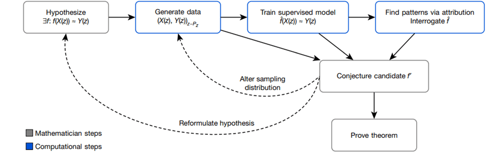 Figure 1. Experimental methodology used by Davies, et.al. (Figure 1 from “Advancing mathematics by guiding human intuition with AI”. Nature, Vol 600, 2 December 2021)