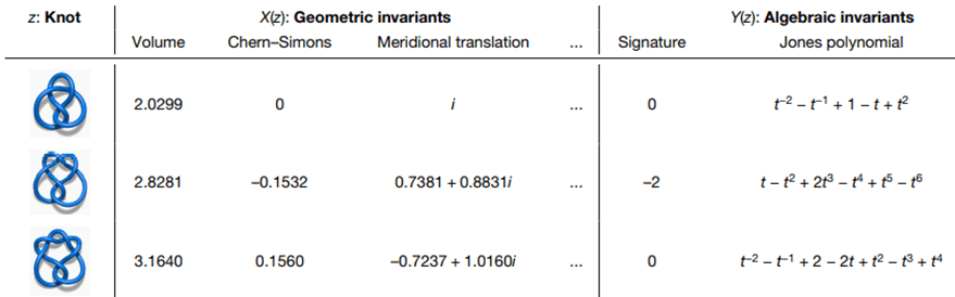 Figure 2. Geometric and algebraic invariant of hyperbolic knots. (Figure 2 from “Advancing mathematics by guiding human intuition with AI”. Nature, Vol 600, 2 December 2021)