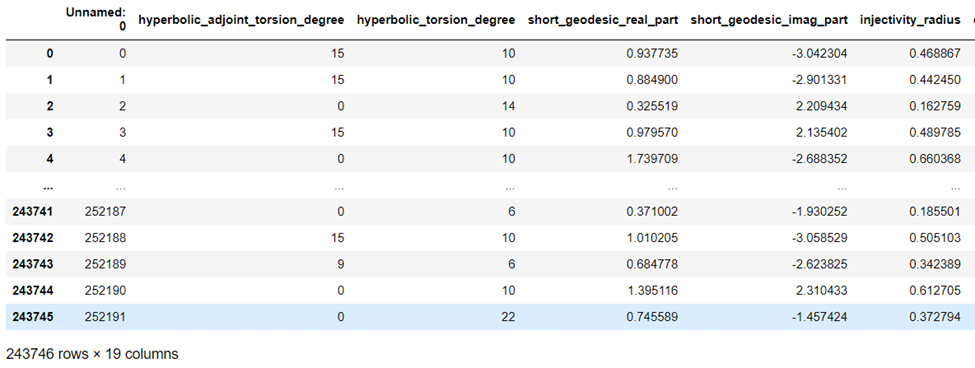 Figure 3. Snapshot of the Knot invariant data rendered as a python pandas dataframe.