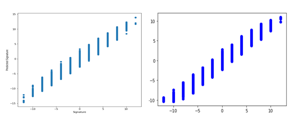 In Figure 5, we show scatter plots of the predicted signature versus the real signature of each of the knots in the test suit. As you can see, the predicted signatures form a reasonably tight band around the diagonal (true signatures). The mean squared error of the formula slope(K)/2 from the true signature was 0.86 and the mean squared error of the model predictions was 0.37. This suggests that the conjecture may need some small correction terms, but that is up to the mathematician to prove. Otherwise, we suspect the bounds in the inequality are reasonable.