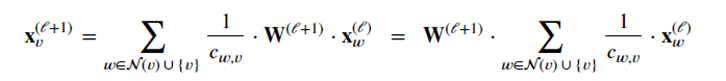 where 𝐖(ℓ+1) denotes a trainable weight matrix of shape [num_outputs, num_inputs] and 𝑐𝑤,𝑣 refers to a fixed normalization coefficient for each edge. In our case 𝑐𝑤,𝑣 is the number of edges coming into node v divided by the weight of the edge. Our network is described below.