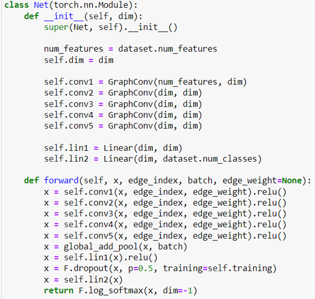 The forward method uses the x node property and the edge index map to guide the convolutional steps. Note that we will use batches of molecules in the training and the parameter batch is how we can distinguish one molecule from another, so that the vector x is finally a pair of values for each element of the batch. With edge_weight set to None, the weight of each edge is a constant 1.0.