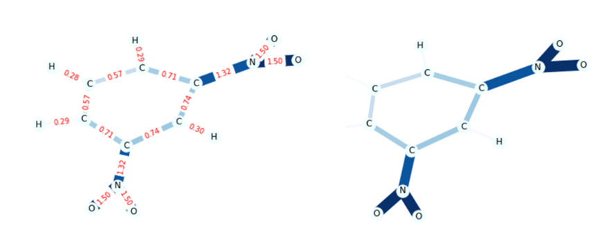 Looking at a sample from the set of mutagenic molecules, we can view the integrated gradients for each edge. In figure 6 below on the left we show a sample with the edges labeled by their IG values. To make this easier to see the example code replaces the IG values with a color code where large IG values have thicker darker lines.