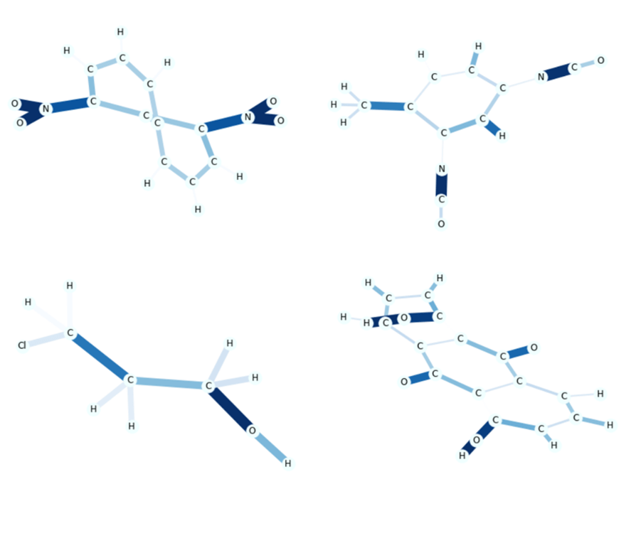 The article from J. Med. Chem notes that the occurrence of NO2 is often a sign of mutagenicity, so we are not surprised to see it in this example. In Figure 7, we show several other examples that illustrate different salient subgraphs.