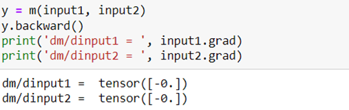 We can directly compute the gradient using basic automatic differentiation in Torch. When we evaluate the partial derivatives for these values of input1 and input2 we see they are zero.