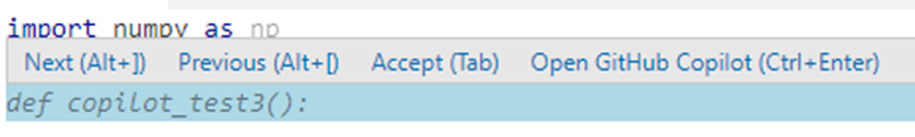 Once installed, If you open Visual Studio Code to a blank python file, you will find copilot almost too eager to start work. Starting with a file named copilot_test3.py and inserting the line “import numpy as np”, Copilot immediately had a suggestion for the next line as shown below. Hovering over this proposed line produces the alternative actions: next suggestion, previous suggestion or accept.