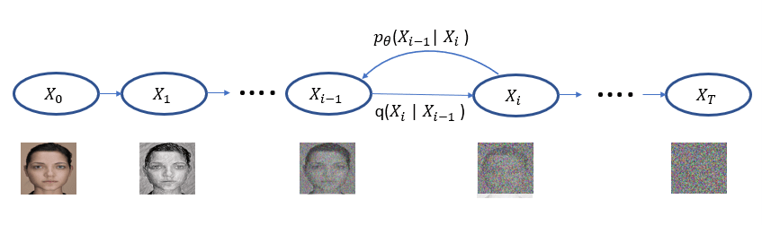 The idea behind Diffusion is simple. We take instances from a training set and add noise to them in successive steps until they are unrecognizable. Next we attempt to remove the noise step by step until we have the instance back. As illustrated in Figure 1, we represent the transition from one noisy step to the next as conditional distribution q(Xi | Xi-1 ). Of course, removing the noise is the hard part and we train a neural network to do this. We represent the denoising steps based on that network as pꝋ(Xi-1 | Xi ).