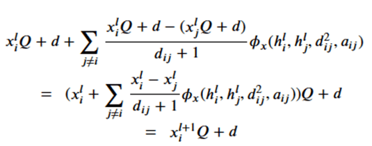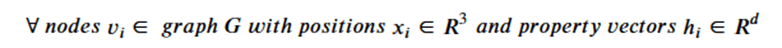 Note that dij is the distance between node I and j and so is invariant to the rotations and translations of the molecule. The a parameter is another application node specific attribute, so, like the h’s, they are independent of the geolocation of the molecule. From this we can conclude the m’s and e’s are also not dependent upon the x’s. That leaves the last equation. Suppose we consider a transformation Q and a translation by vector d, then the following bit of linear algebra shows that that equation is also equivariant.