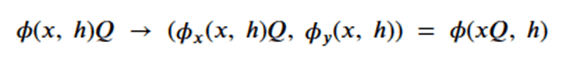 Graph neural networks that exploit features of their Euclidean space representation, i.e. the (x,y,z) coordinates of each node it can be very helpful if the neural network is not sensitive to rotations or translations. This property is called equivariance. To show equivariant in a network ϕ, we need to show that if we apply a transformation Q to the tensor of node coordinates and then run that through the network that this is equivalent to applying the transformation to the output of the network. We keep in mind that the application of the transformation is matrix multiplication and that the node data h is independent of the coordinates. Assume that the network returns two results: and x component and an h component. Then equivariance can be stated as