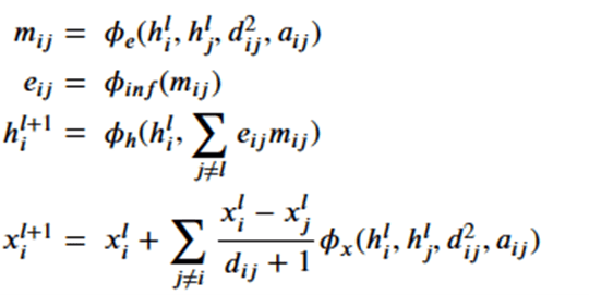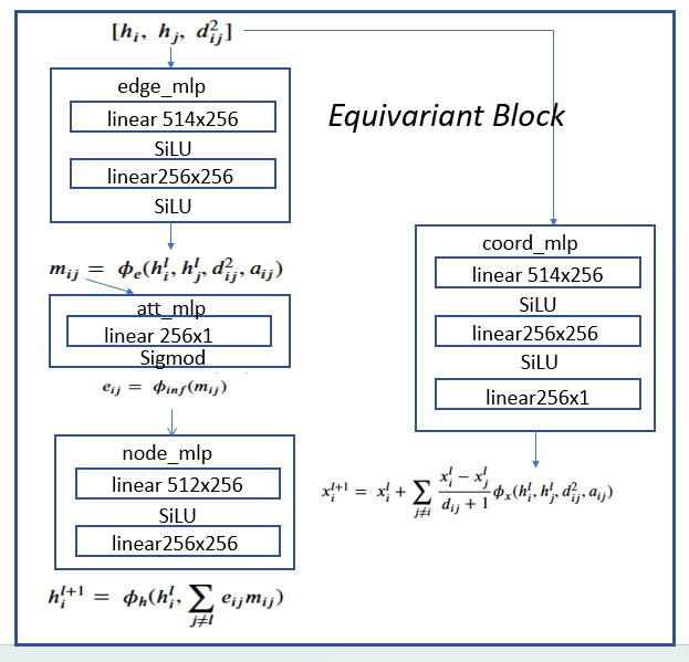 Figure 4. Equivariant block consisting of edge_mlp = ϕe, att_mlp= ϕinf , node_mlp= ϕh and