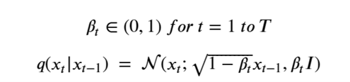 It is very easy to get lost in the mathematics behind diffusion models, so what follows is the briefest account I can give. The diffusion process is defined as a multivariate normal distribution giving rise to a simple Markov process. Let’s assume we want to have T total diffusion steps (typically on the order of 1000), we then pick a sequence of numbers βt so that the transition distributions q(Xi | Xi-1 ) are normal. Writing