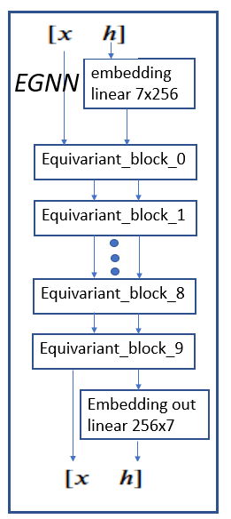 The full egnn network is shown in Figure 5. It consists of the embedding for h followed by 10 equivariant blocks. These are followed by the output embedding.