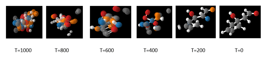 which is the denoising step from figure 2. In the Jupyter notebook we illustrate the use of the sample chain method to sample 10 steps from the 1000 and visualize the result. We repeat the process until the sequence results in a stable molecule. A typical result is shown in Figure 5 below.