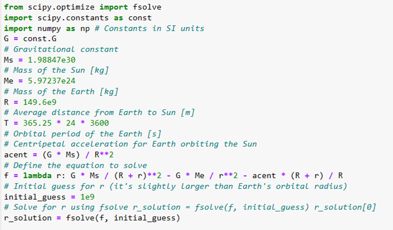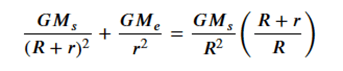 Let’s do this calculation now. We’ll be using an iterative numerical method to solve for ( r ) because it’s a transcendental equation and cannot be solved analytically with simple algebra. We’ll take data for ( M_s, M_e, R, ) and ( G ) from standard astronomical values.