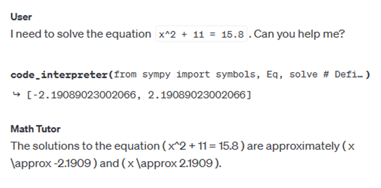 instructions=”You are a personal math tutor. Write and run code to answer math questions.”,