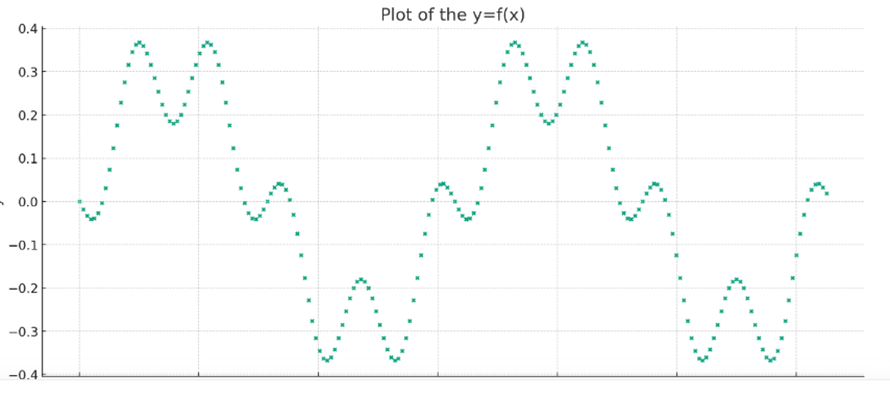 - The data in the json file ‘https://github.com/dbgannon/openai/blob/main/ypoints7.json’ consists of x,y coordinates y=f(x) produced by a function f that is a sum of simple periodic functions. Can you describe the function?