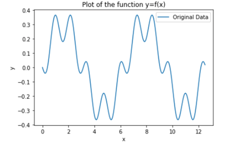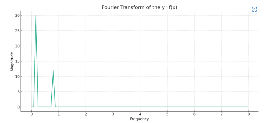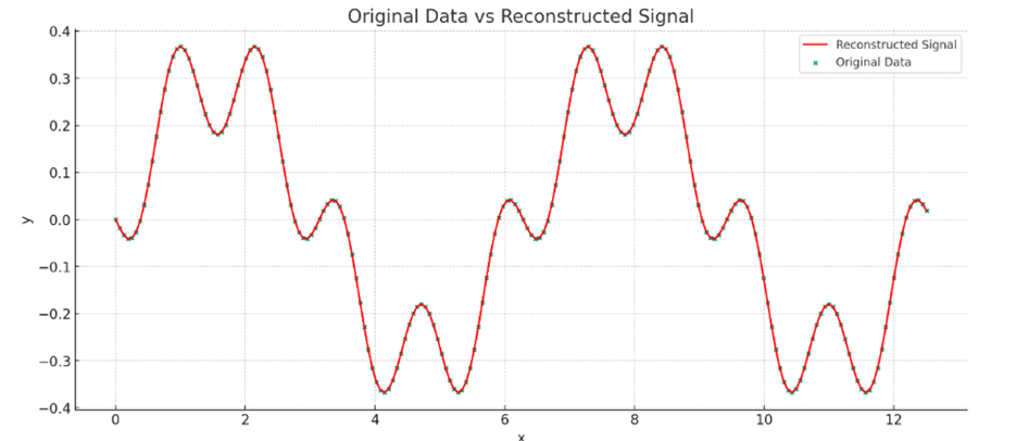 The reconstructed signal plot shows how this combination of two cosine waves closely matches the original data points. It’s important to note that this is an approximation, and the true function may have more components that weren’t captured by this analysis due to their smaller amplitudes or because of the limitations of discrete Fourier Transform.