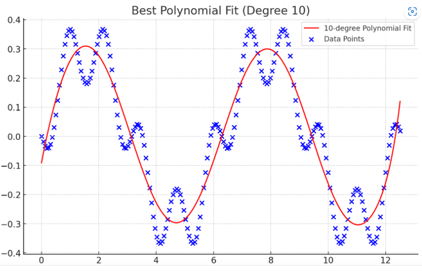 After fitting polynomial regression models with degrees ranging from 2 to 10, the model with the best coefficient of determination (R²) is a 10th-degree polynomial with an R² score of approximately 0.869. While a 10th-degree polynomial may seem complex, it suggests that the underlying function is quite intricate.