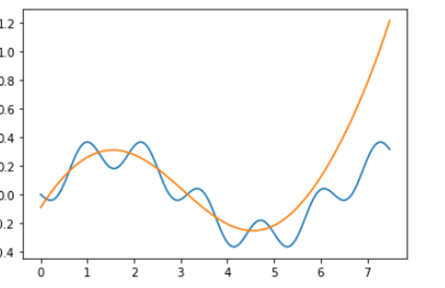 It is interesting to note that the response is now to fit a polynomial to the data without recognizing its periodic nature. The graph of the result is correct only to point 4 on the x axis. After that point the polynomial blows up. In other words, the graph of the result is a hallucination. The actual plot of the polynomial is shown below.
