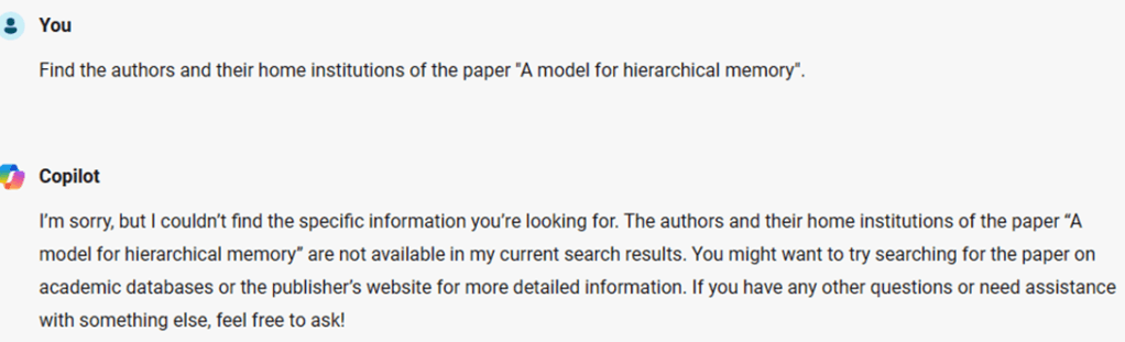Msg = ‘Find the authors and their home institutions of the paper “A model for hierarchical memory”.’